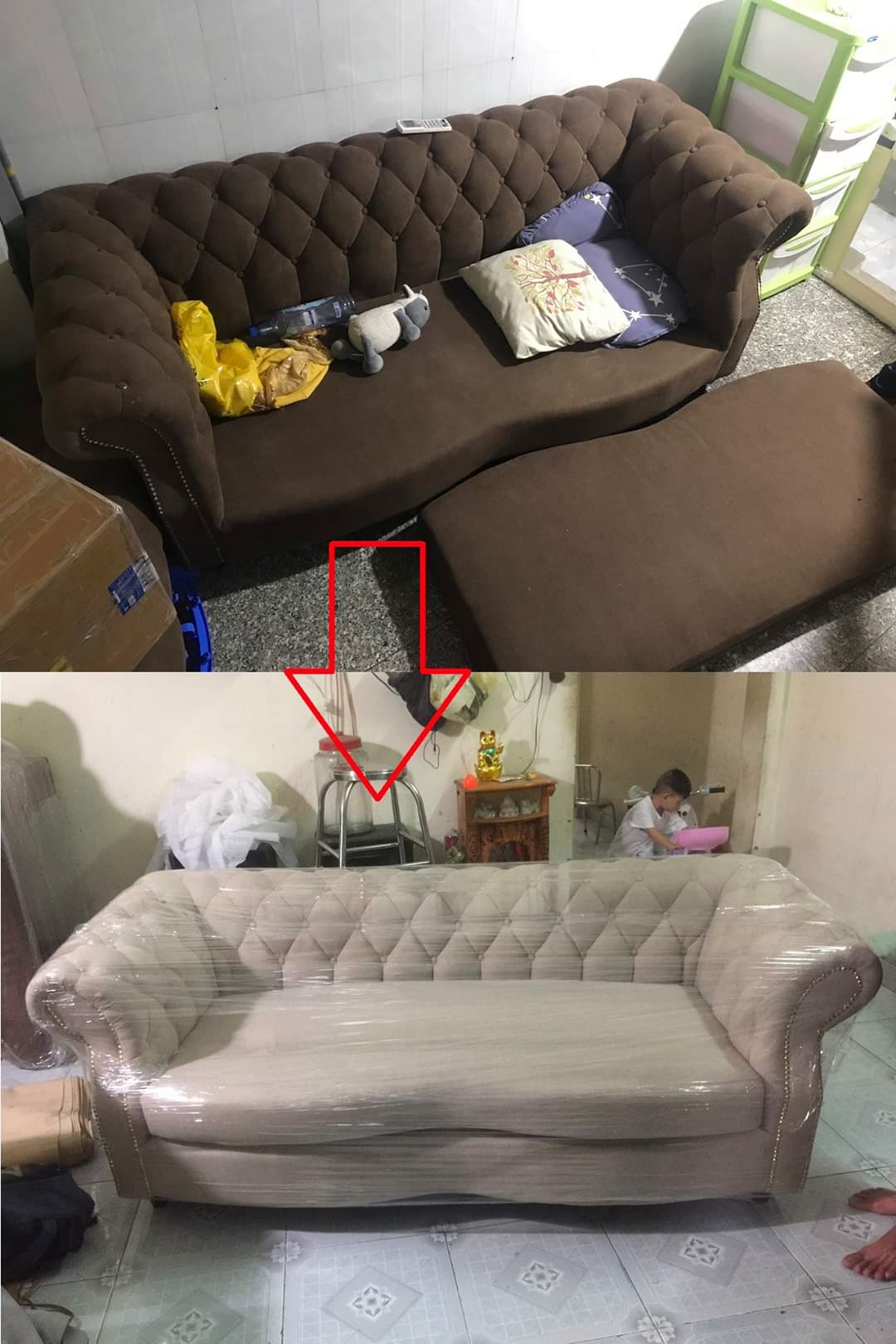 Tháo bỏ lớp da/vải cũ, vệ sinh sạch phần khung.